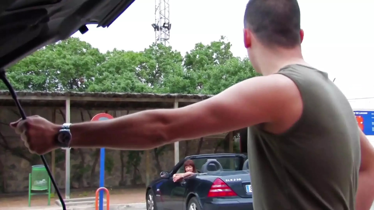 Busty Spanish MILF with fake big boobs receives her ass hole fucked in her car. She moans loudly as he pounds her tight hole, making her car vibrate. He cums in her mouth at the end, leaving her happy and satisfied.