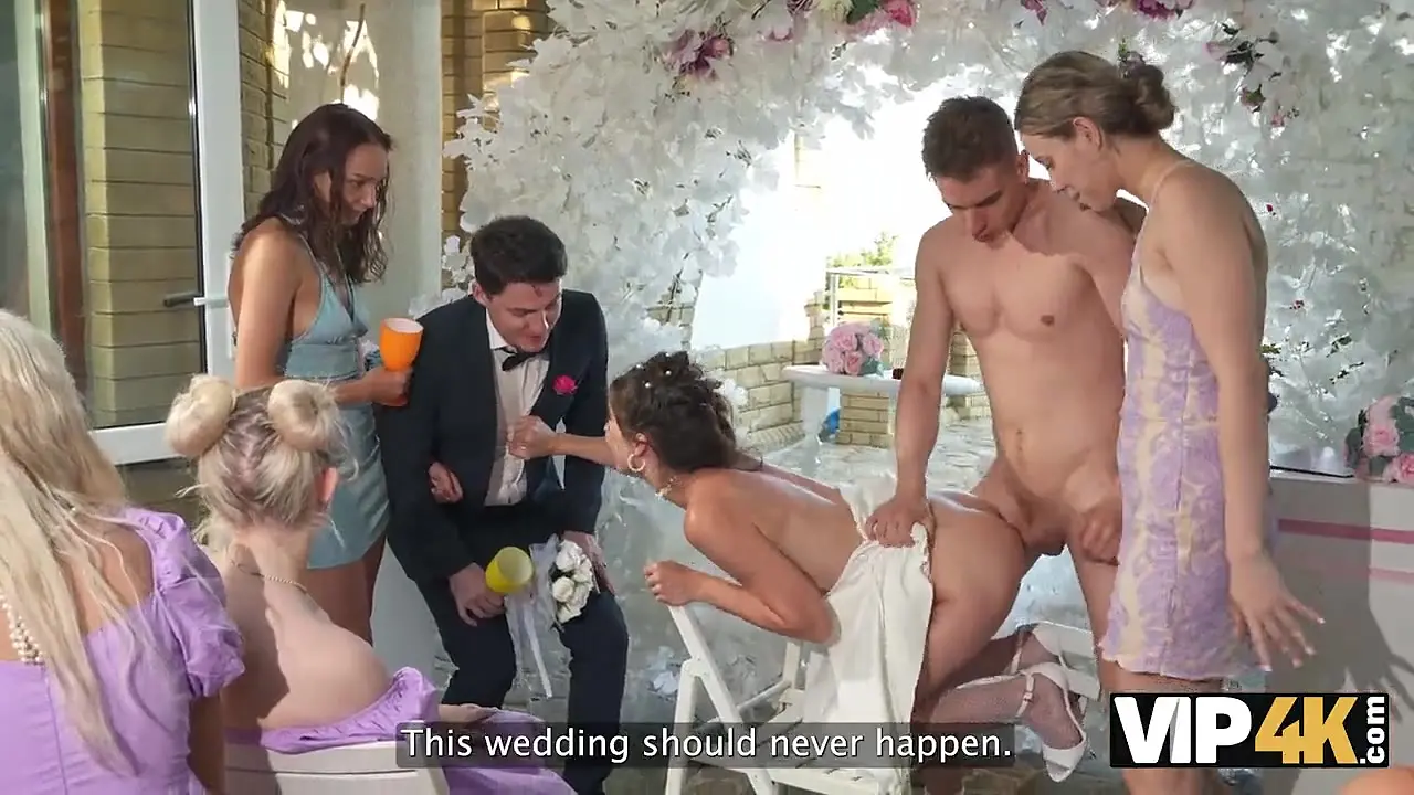Beautiful bride in a stunning wedding dress gets caught cheating and is fucked hard by a handsome stranger in public while her angry fiancé watches. She takes a deep anal creampie, making the scene even more scandalous.