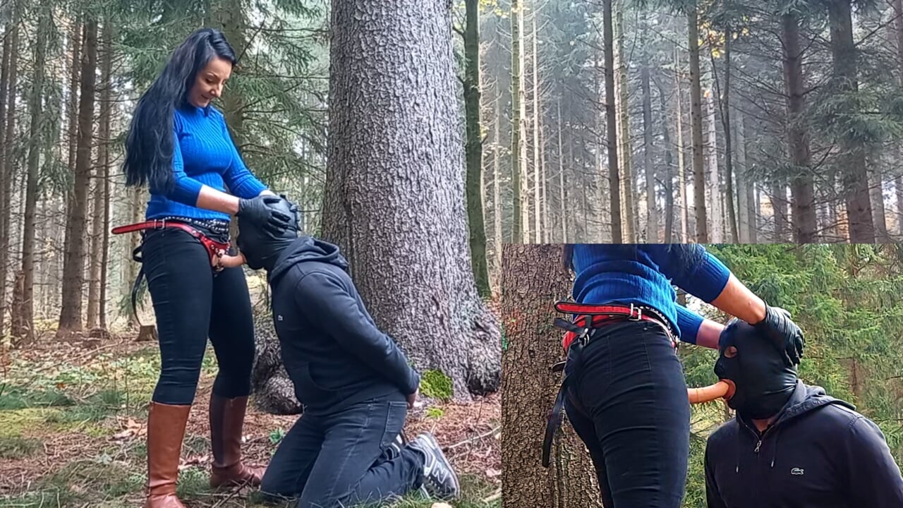 A loser is taken into the forest where a dominant mistress awaits. She anals him deep and then makes him give head. He is her BDSM slave and must endure her strapon and spitting domination.