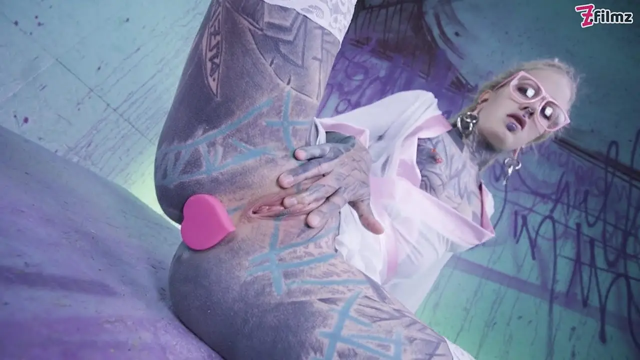 A heavily tattooed and pierced teen girl with glasses sucks a big dick and rides it cowgirl style. She loves the feeling of his tattooed cock inside her and shows off her split tongue. He pounds her tight pussy doggystyle while she licks her finger and teases her nipple piercings.